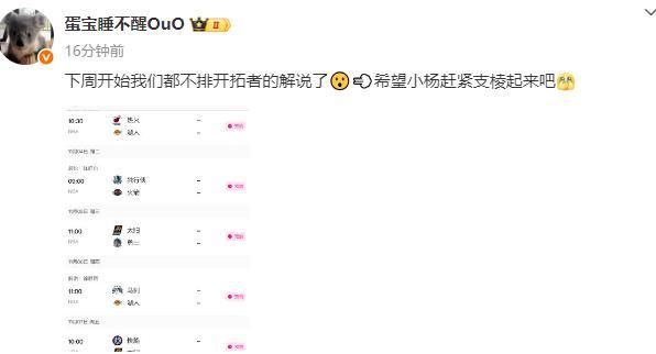 甚至有些平台已不不排开拓者的比赛,比如上图中,某平台知名女主播蛋宝透露,平台已经不排杨瀚森的解说了,希望杨瀚森赶紧支棱起来!主播透露因为球迷不喜欢看,影响收视率,他们也没办法!